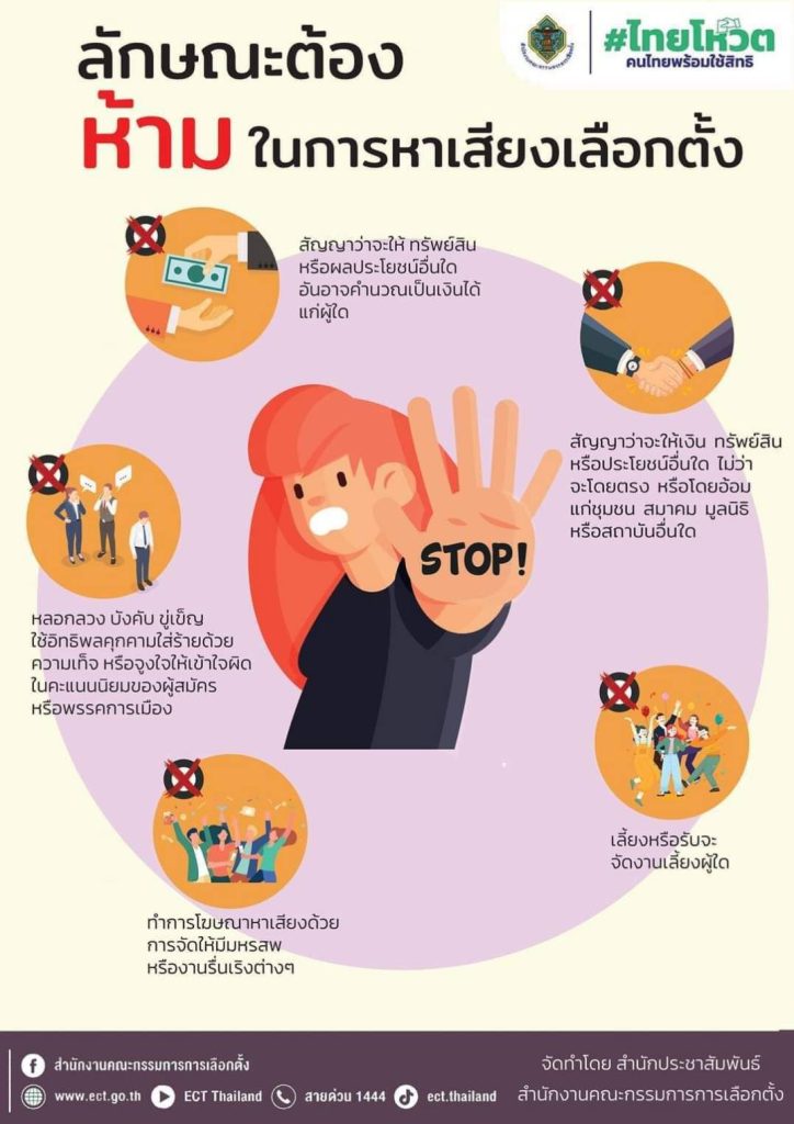ลักษณะต้องห้ามในการหาเสียงเลือกตั้ง หากพี่น้องประชาชนไม่ได้รับความสะดวก หรือพบเห็นการกระทำความผิด โปรดแจ้งสายด่วน 191 หรือ1599 หรือ สายด่วน กกต.1444 หรือสถานีตำรวจในพื้นที่ ได้ตลอด 24 ชั่วโมง สำนักงานตำรวจแห่งชาติพร้อมที่จะดูแล บำบัดทุกข์ บำรุงสุข ให้กับประชาชนในทุกภารกิจ